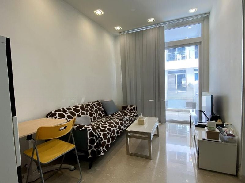 Step into this beautifully renovated 1-bedroom unit at Kovan Grandeur, where modern elegance meets urban charm. The living room greets you with an eye-catching city-themed feature wallpaper, large windows that invite natural light, and recessed ceiling lighting that enhances the contemporary ambiance. The marble-look floor tiles add a touch of sophistication, creating a warm and inviting atmosphere.