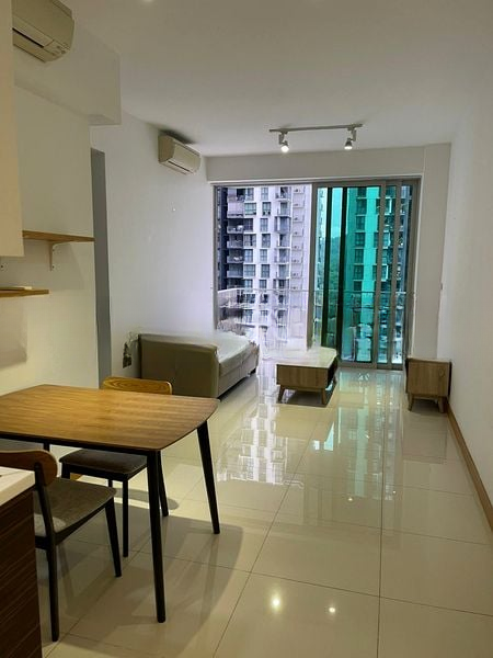 Step into this bright and airy 2-bedroom unit at Tree House, where abundant natural light floods the open-concept living and dining areas, accentuated by polished tile flooring and elegant track lighting. The balcony offers stunning unblocked views of the lush greenery, city skyline, and the inviting pool below, creating a serene ambiance that invites relaxation.
