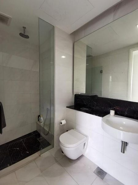This well-maintained 2-bedroom unit features a thoughtful layout, including a corner bedroom with wood flooring and direct access to a private balcony. The modern bathroom boasts a luxurious bathtub with a view, a walk-in shower with a glass partition, and elegant black marble accents. Every detail has been carefully considered, from the marble vanity tops to the seamless flow between spaces.