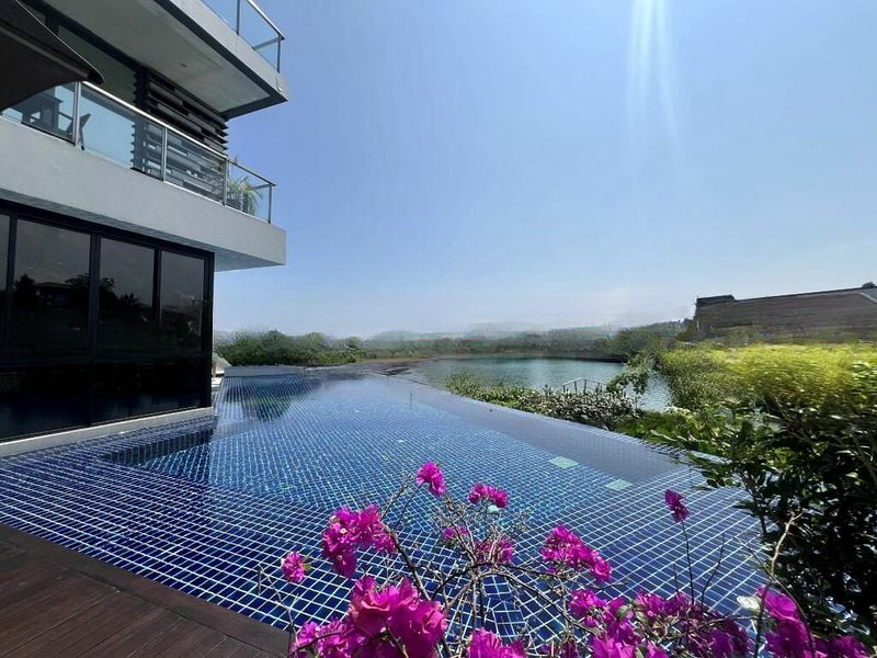 Step into a realm of modern luxury where abundant natural light dances through floor-to-ceiling windows, illuminating the exquisite marble flooring and designer finishes throughout this stunning landed home. The breathtaking views of the infinity pool, serene lake, and lush greenery create an inviting ambiance that instantly captivates.