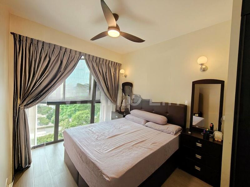 This efficient 3-bedroom plus study layout is designed for comfortable living. The spacious living room boasts a built-in wall unit and direct balcony access, while the dining area is enhanced by a large wall mirror and track lighting, perfect for entertaining. Each bedroom is thoughtfully appointed with ceiling fans and ample storage, including a dedicated study room ideal for remote work or creative pursuits.