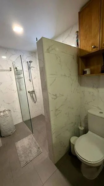 Step into a warm and inviting sanctuary at River Place, where the cozy ambiance is accentuated by natural light filtering through floor-to-ceiling windows. The marble-look wall tiles and granite-look floor tiles create a sophisticated backdrop, while the large wall mirror enhances the sense of space and light, offering a glimpse of the stunning city skyline and lush greenery beyond.