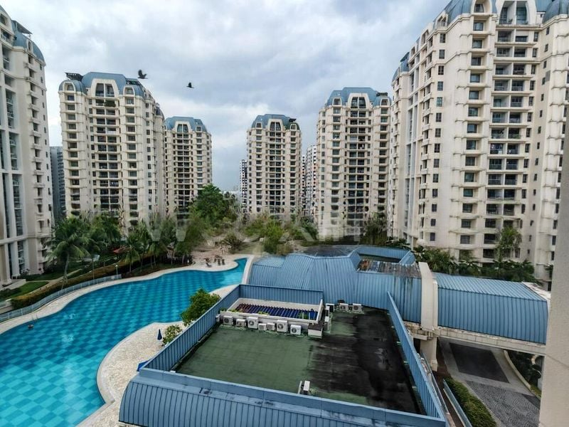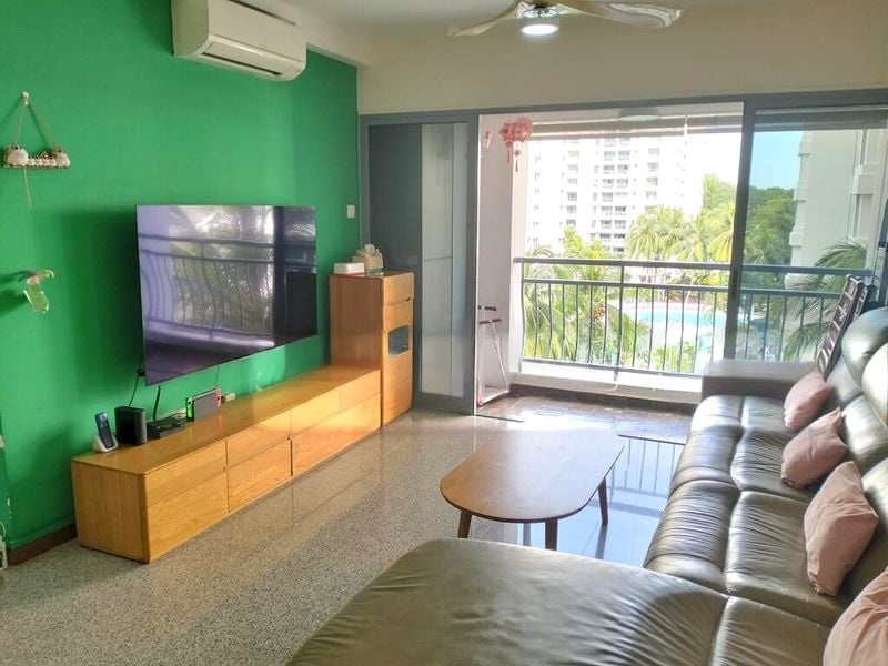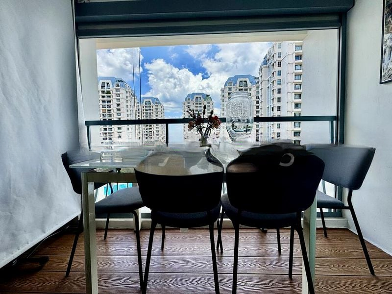 Step into this beautifully renovated unit at Aquarius By The Park, where abundant natural light floods the space, creating a bright and airy ambiance. The striking green feature wall in the living room complements the serene pool view visible from the balcony, inviting you to relax and unwind in style.
