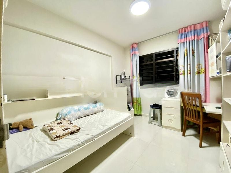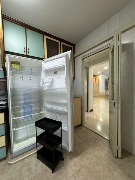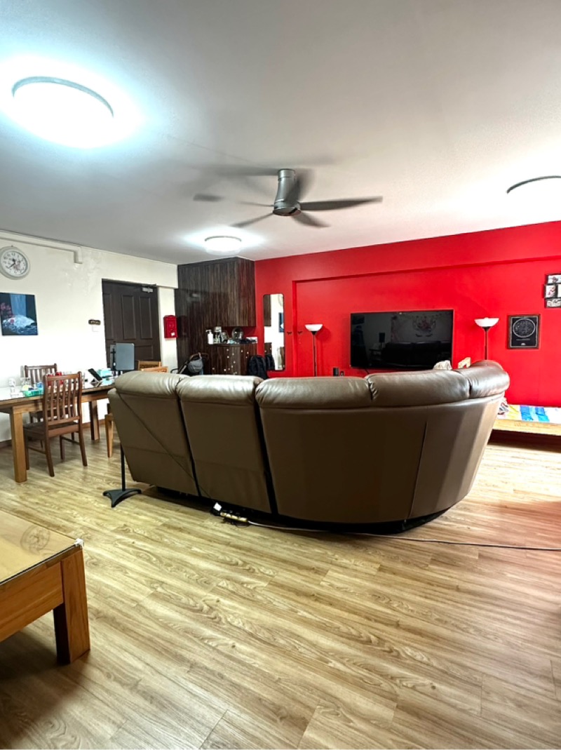 Step into a world of eclectic charm as you enter this well-maintained 3-bedroom flat at Choa Chu Kang Cres. The vibrant red feature wall in the living room, complemented by wood-look flooring and a ceiling fan, creates an inviting ambiance. Natural light filters through, enhancing the lush greenery views from the windows, while the leather recliner sofa beckons you to unwind in style.