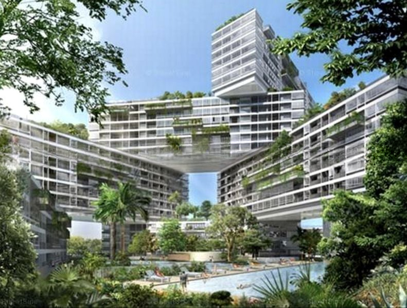 Step into a modern architectural resort at The Interlace, where abundant natural light floods the spacious interiors through floor-to-ceiling windows, offering breathtaking views of lush greenery, the swimming pool, and the city skyline. The iconic stacked-block architecture and glass balustrades create an inviting ambiance that instantly captivates.