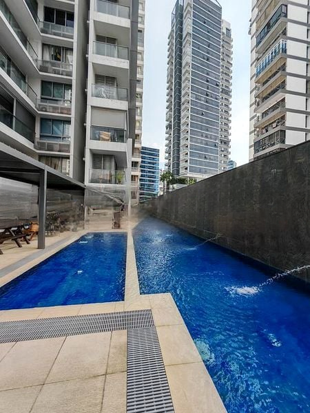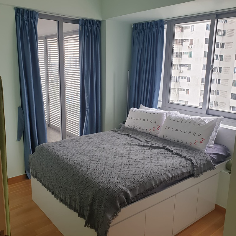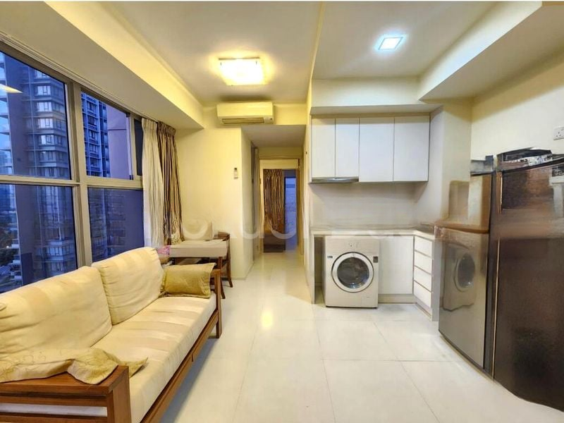 This efficient 1-bedroom layout boasts a master bedroom with a cleverly designed en-suite bathroom, complete with a glass shower partition and wall-hung toilet. The compact kitchen is equipped with white cabinetry and modern appliances, while the living area invites relaxation with its split-unit air conditioning and stylish furnishings. Enjoy the convenience of built-in wardrobes and a storage bed base that maximizes space without compromising on style.