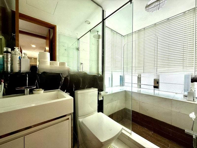 This well-maintained 2-bedroom, 2-bathroom condo features standout elements such as a galley kitchen with integrated appliances, a luxurious rain shower in the bathroom, and a master bedroom equipped with a mirrored sliding wardrobe and an integrated vanity desk. The thoughtful layout maximizes space, with a cozy bay window seating area perfect for relaxation or work, and additional rooms designed for versatility, including a compact study and a bedroom with bunk beds.