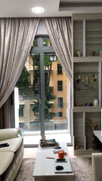 Step into this beautifully renovated unit at D'WEAVE, where modern minimalist design meets abundant natural light. The open-concept living area features large floor-to-ceiling windows that invite the urban landscape inside, creating a bright and airy ambiance. Polished tile flooring throughout enhances the sleek aesthetic, while the white gloss kitchen cabinetry adds a touch of elegance.