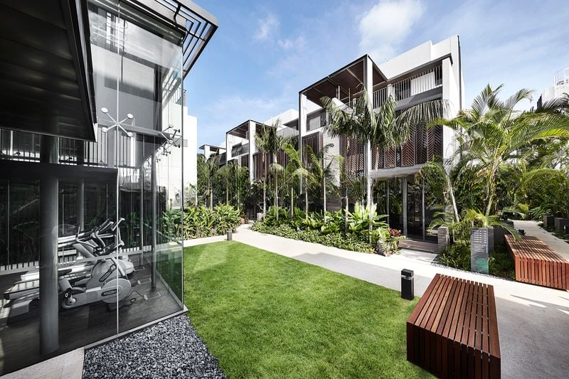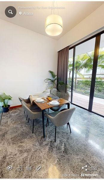 Step into a world of elegance as you enter this stunning designer cluster terrace at Alana. Bathed in abundant natural light, the open-concept living and dining area features floor-to-ceiling glass panels that frame picturesque views of the pool and lush greenery. The bright and airy ambiance, complemented by ornate architectural screens and a modern white facade, creates an inviting atmosphere that feels like home.