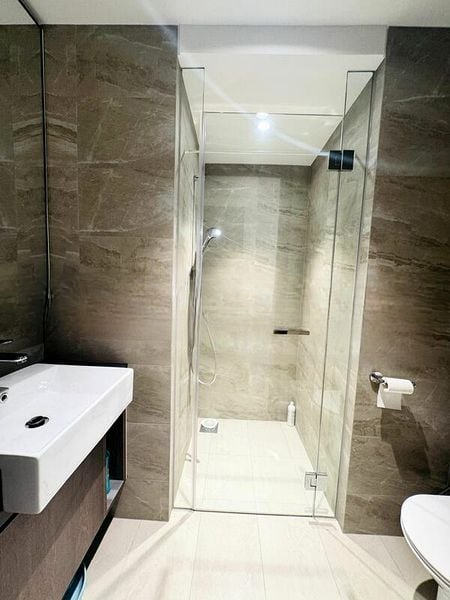 This efficient 2-bedroom, 2-bathroom layout features standout elements such as an L-shaped kitchen with dark grey cabinetry and white countertops, perfect for culinary enthusiasts. The master bedroom boasts an integrated bed headboard storage, while the bathroom impresses with a stylish vessel sink and glass shower screen. Experience the convenience of a dedicated kitchen space near the entrance, enhancing the flow of this modern home.