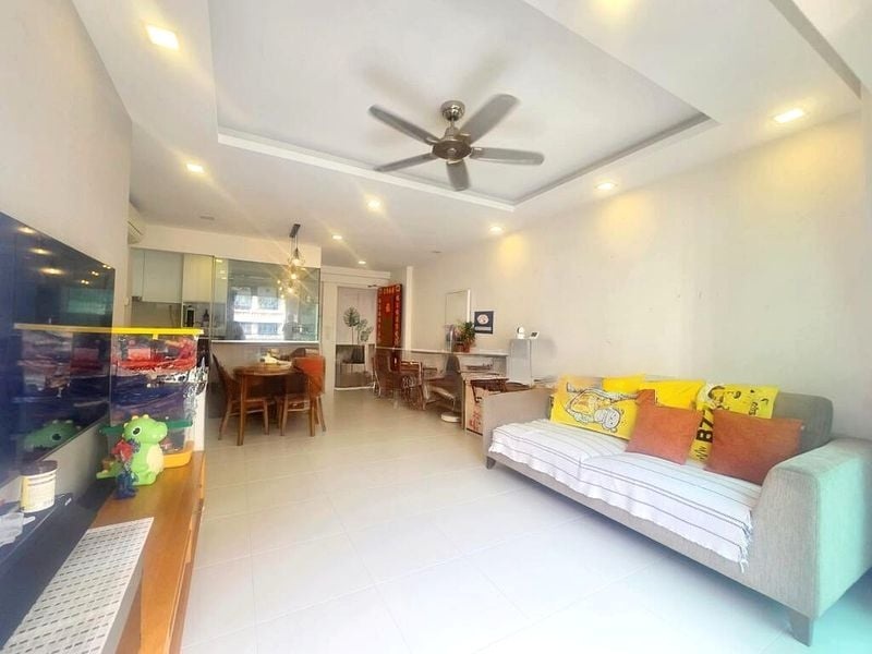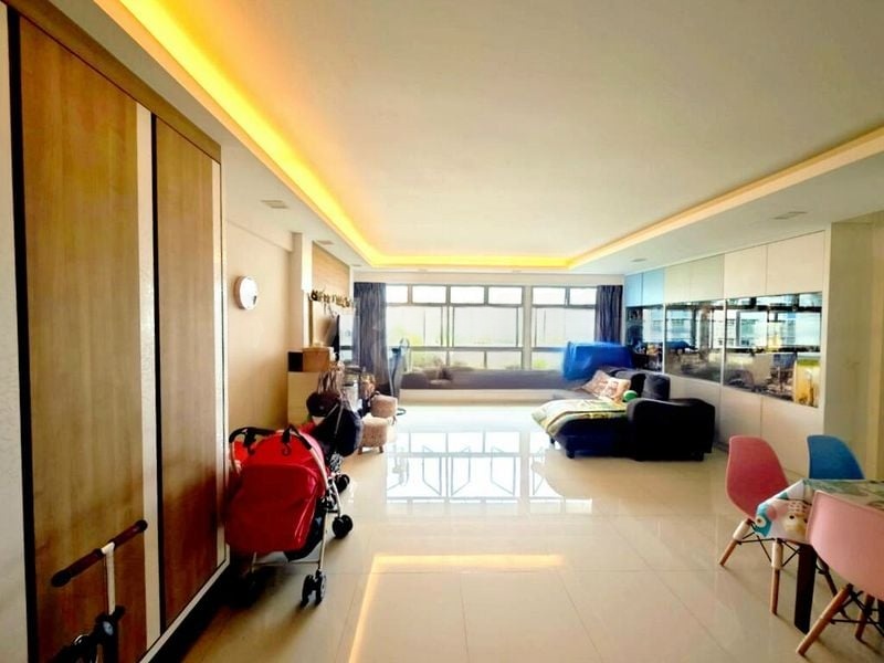 Step into a world of modern elegance at this well-maintained HDB flat, where natural light dances across the spacious interiors, highlighting the sleek finishes and urban landscape views. The ambiance is both functional and inviting, with a distinctive wavy building facade that adds character to your living experience.