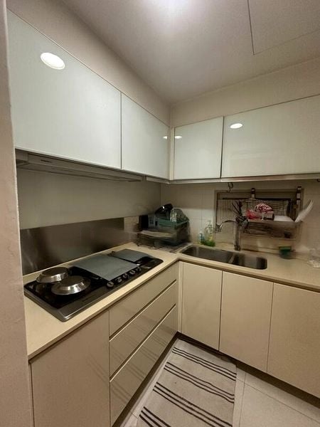 Step into a world of modern elegance as you enter this beautifully renovated unit at The Centris. The open-concept living room greets you with its bright ambiance, featuring white floor tiles and a built-in media unit that seamlessly blends style and functionality. Natural light pours in through large windows, highlighting the designer pendant lighting and the inviting piano area, creating a warm and welcoming atmosphere.