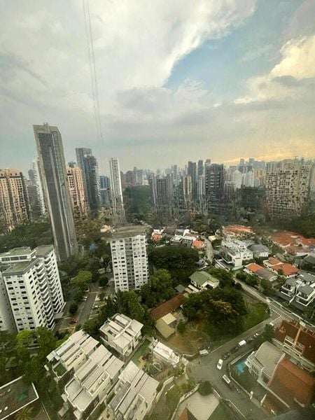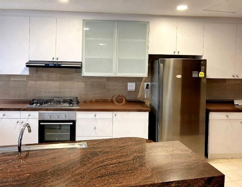 Step into a world of modern elegance as you enter this stunning 5-bedroom condominium at Orchard Bel Air. Bathed in abundant natural light, the open layout showcases a designer kitchen featuring a striking black island with bar stools, complemented by sleek white cabinetry and high-end stainless steel appliances. The high-floor unit offers breathtaking panoramic views of the city skyline, lush greenery, and the inviting swimming pool, creating a serene urban oasis.