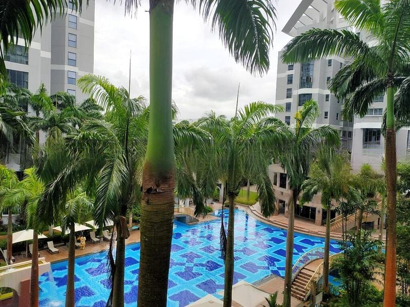 Step into a bright and airy sanctuary at The Bayshore, where abundant natural light floods the spacious living areas. The classic parquet flooring adds warmth, while the floor-to-ceiling windows frame picturesque views of the resort-style swimming pool and lush greenery, creating a serene ambiance that invites relaxation.