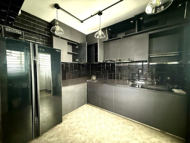 Step into this stunning 3-bedroom HDB unit and be captivated by its modern industrial ambiance. The space is awash with natural light, highlighting the sleek black cabinetry and striking cement screed feature wall. The industrial-style track lighting and glass box chandelier create an inviting atmosphere, while the custom superhero wall mural adds a playful touch to the living spaces.