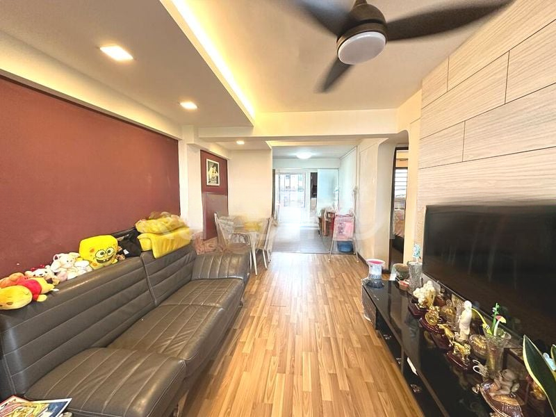 Step into a world of nostalgia with this charming HDB flat, where original terrazzo-style flooring greets you at the entrance, complemented by large windows that invite natural light and offer serene views of the surrounding greenery. The ambiance is functional yet inviting, with a chandelier light fixture adding a touch of character to the living room, making it a perfect space for relaxation or entertaining.