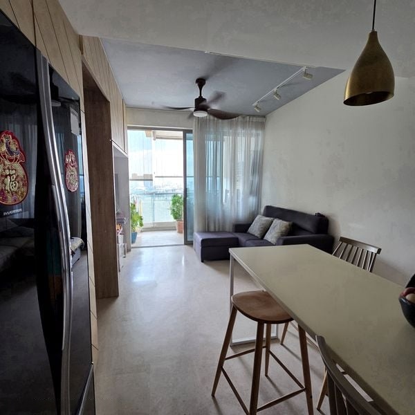 This efficient 3-bedroom layout features a standout living room with a ceiling fan and track lighting, seamlessly connecting to the balcony. The dining area boasts an integrated breakfast bar adorned with gold pendant lights, while the kitchen is equipped with custom wood cabinetry and integrated appliances, perfect for culinary enthusiasts. The master bedroom, with its lavender accent walls and large windows, offers a serene retreat, complemented by two additional well-appointed bedrooms.