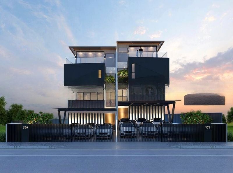 This impressive unit boasts seven spacious bedrooms, each adorned with designer headboards and pendant lighting, complemented by elegant wooden flooring. The open-concept dining room, highlighted by a stunning designer chandelier, flows seamlessly into the island kitchen, equipped with white cabinetry and integrated appliances. The private roof terrace is perfect for entertaining, featuring a BBQ grill and outdoor lounge, while the multi-car porch ensures ample parking for your guests.