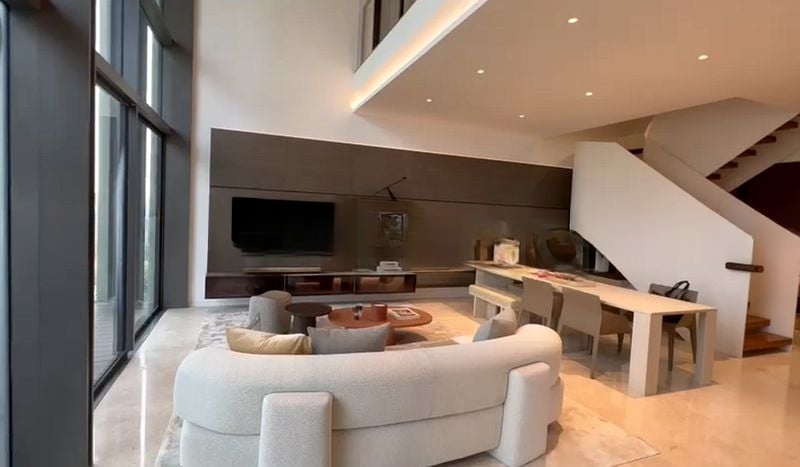 Step into a realm of modern luxury as you enter this exquisite 4-bedroom unit at 3 Orchard By-The-Park. The moment you walk in, you are greeted by a stunning sculptural spiral staircase and a captivating book-matched marble feature wall that exudes elegance. Natural light filters through the floor-to-ceiling windows, illuminating the spacious living area adorned with recessed cove lighting and large format floor tiles, creating an inviting ambiance.
