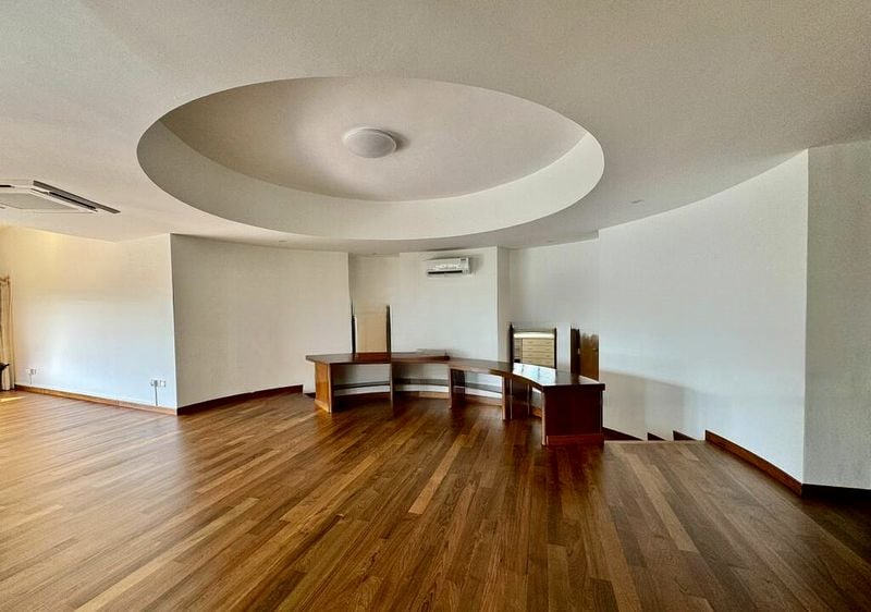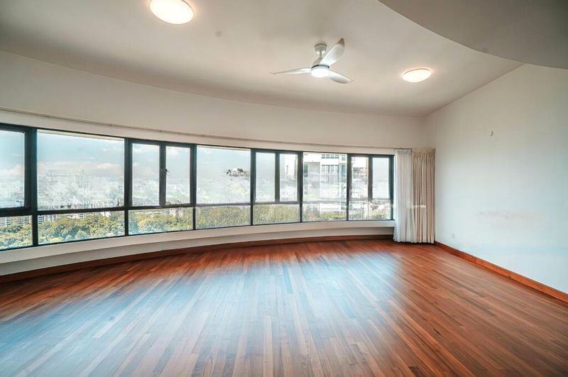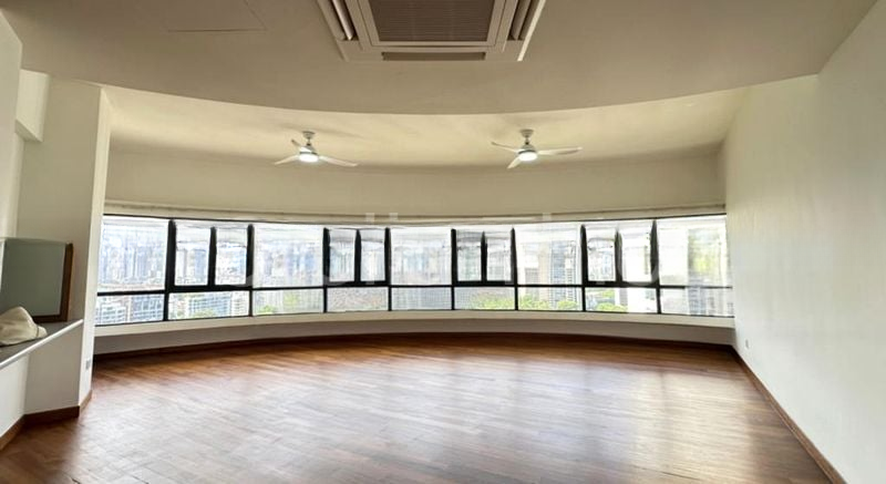 Step into a bright and airy sanctuary at The Draycott, where abundant natural light floods through panoramic curved windows, offering breathtaking views of the city skyline and unblocked greenery. The inviting ambiance is complemented by elegant wood parquet flooring and a recessed ceiling adorned with cove lighting, creating a warm and welcoming atmosphere.