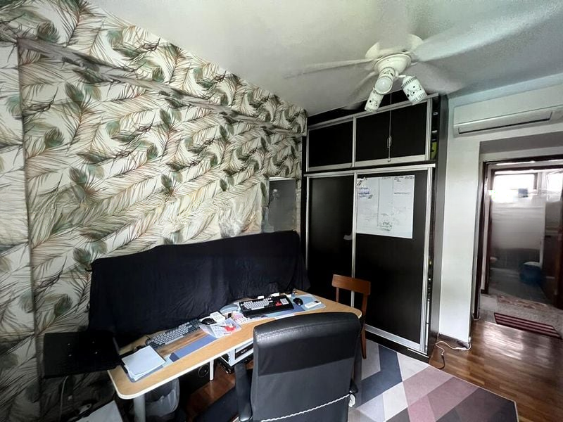 This well-maintained unit boasts four bedrooms, including a versatile study with peacock feather feature wallpaper and a built-in wardrobe. The galley kitchen, equipped with light wood cabinetry and a stylish tiled backsplash, is perfect for culinary enthusiasts. Each bathroom features thoughtful design elements, from the pink pedestal sink to the compact utility bathroom, ensuring functionality without compromising on style.