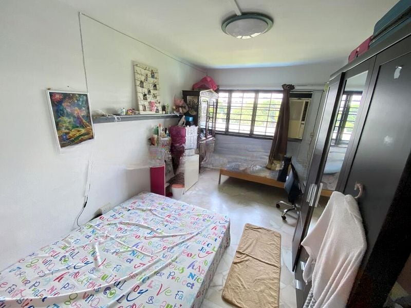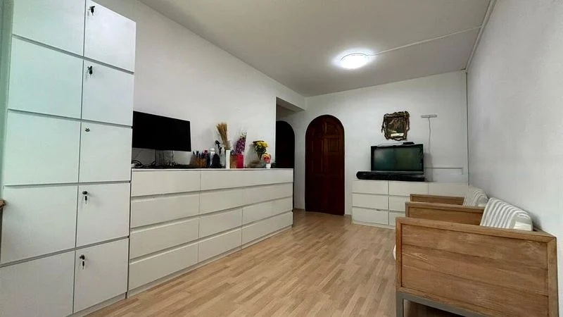 Step into this well-maintained 2-bedroom HDB flat and be greeted by a clean, functional ambiance that invites relaxation. The moderate natural light filters through arched wooden doors, illuminating the inviting living room adorned with wooden armchairs and a long dresser console. Enjoy views of lush greenery and neighbouring buildings from the comfort of your home.