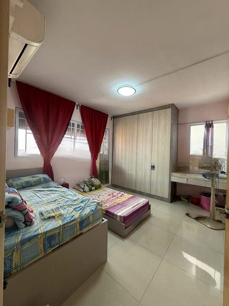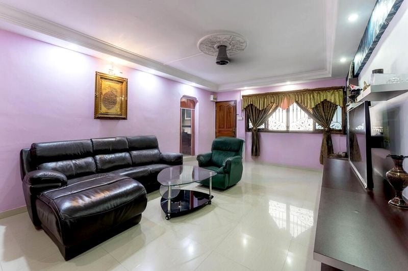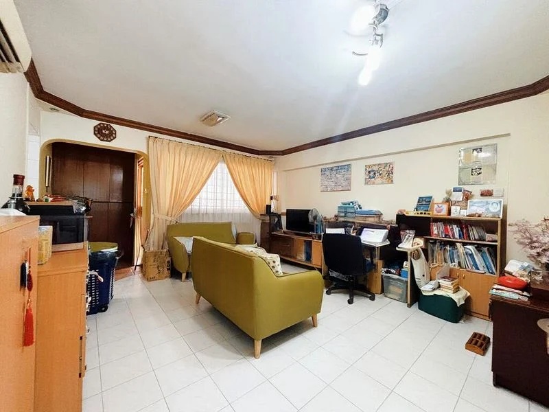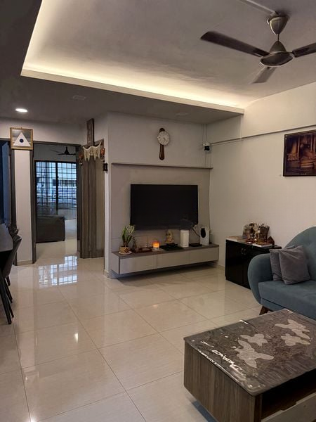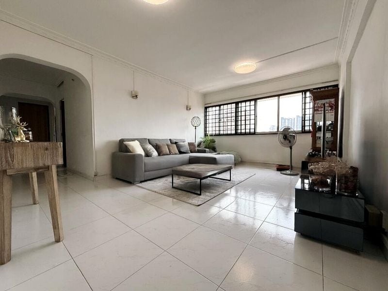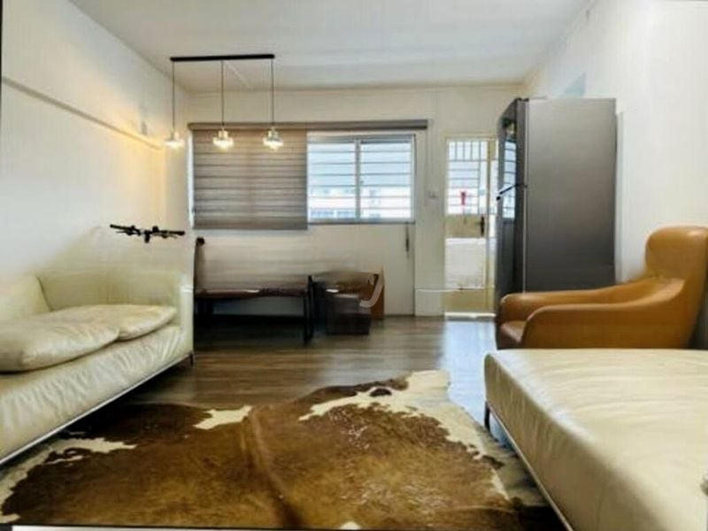 Step into a world of modern minimalism where natural light dances across the well-maintained interiors of this stylish HDB flat. The inviting ambiance is enhanced by a cowhide rug and contemporary circular ceiling lights, creating a warm yet sophisticated atmosphere. Enjoy urban views through large windows adorned with beige curtains, offering a glimpse of the vibrant neighborhood beyond.