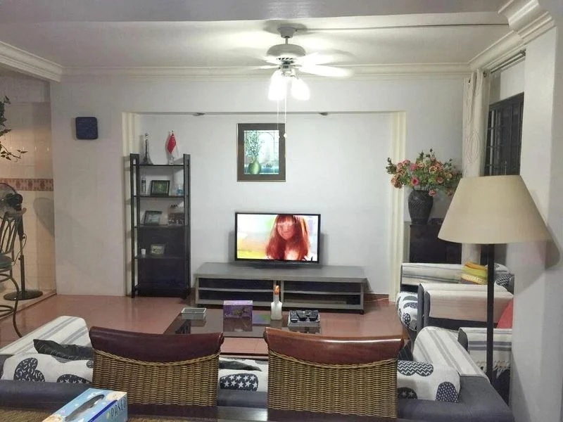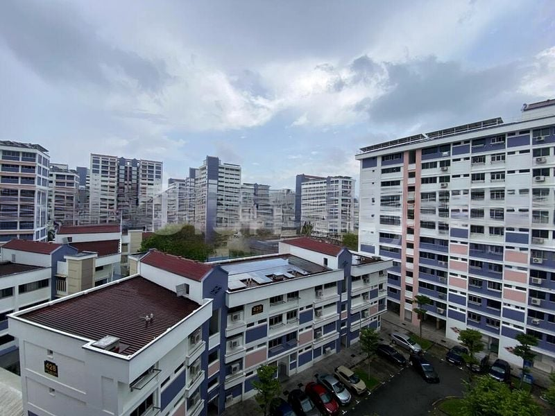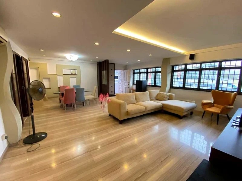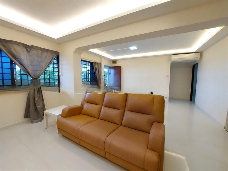 Step into a beautifully renovated HDB flat that exudes warmth and comfort. The spacious open-concept living and dining area welcomes you with polished marble-look tile flooring and large windows that flood the space with natural light. Enjoy urban views of neighboring buildings while relaxing on the L-shaped sofa or gathering around the glass-top dining table, surrounded by colorful upholstered chairs.