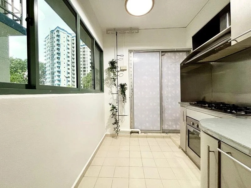Step into a beautifully renovated HDB flat that exudes warmth and comfort. The spacious open-concept living and dining area welcomes you with polished marble-look tile flooring and large windows that flood the space with natural light. Enjoy urban views of neighboring buildings while relaxing on the L-shaped sofa or gathering around the glass-top dining table, surrounded by colorful upholstered chairs.