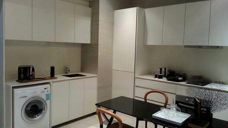 This efficient layout boasts an open-concept kitchen and living area, featuring high-quality white handleless cabinetry, an integrated washing machine, and a built-in oven with an induction hob. The dining area is perfect for entertaining, with a chic black glass-top table and stylish wooden chairs. The bathroom is a sanctuary with a ceiling-mounted rain shower and elegant glass partition, ensuring a luxurious experience.