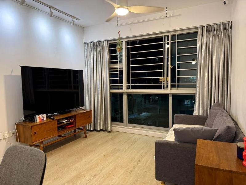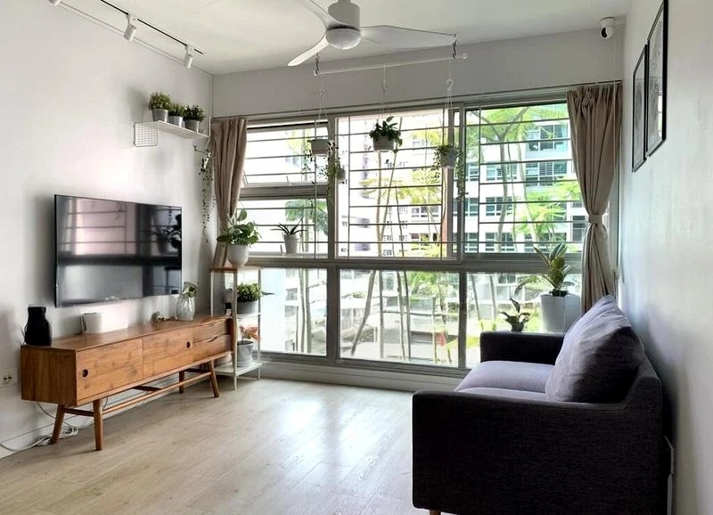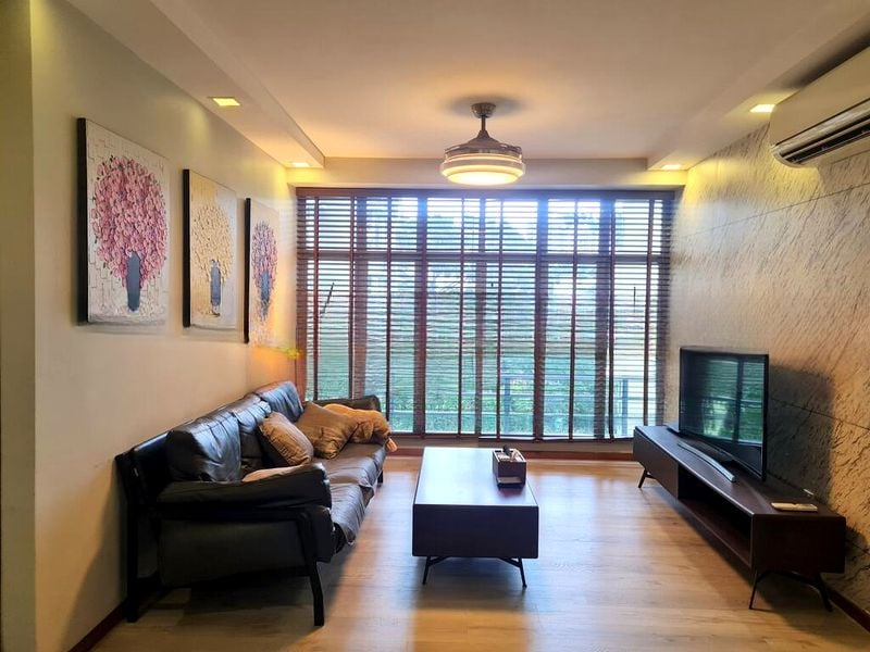 The open-concept layout seamlessly connects the living and dining areas, featuring a modern pendant light and a cozy four-seater dining set. Each room is thoughtfully designed, from the spacious living room with a wooden TV console to the versatile study nook equipped with a compact workspace. The well-maintained unit also boasts modular storage cabinets and indoor plant decor, making it both functional and aesthetically pleasing.