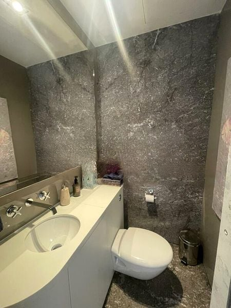 Step into a realm of modern sophistication as you enter this beautifully designed unit at Hilltops. The abundant natural light floods through the floor-to-ceiling windows, illuminating the open-concept living room adorned with elegant teal accent walls and rich hardwood flooring. The seamless blend of indoor and outdoor spaces offers breathtaking views of the city skyline and lush greenery, creating a serene ambiance that invites relaxation.