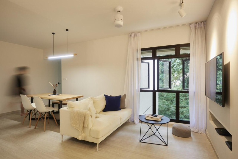 Step into this beautifully designed HDB flat and be greeted by a harmonious blend of modern minimalism and natural light. The open-concept living area features large windows that frame serene greenery views, while the light wood-look flooring and track lighting create an inviting ambiance. The chic black bathroom fixtures and chevron tile backsplash in the kitchen add a touch of sophistication to the space.