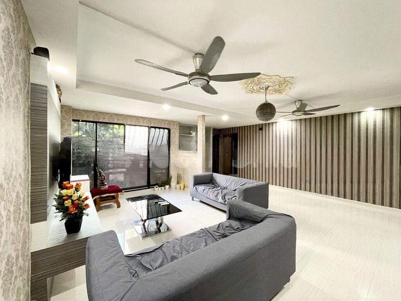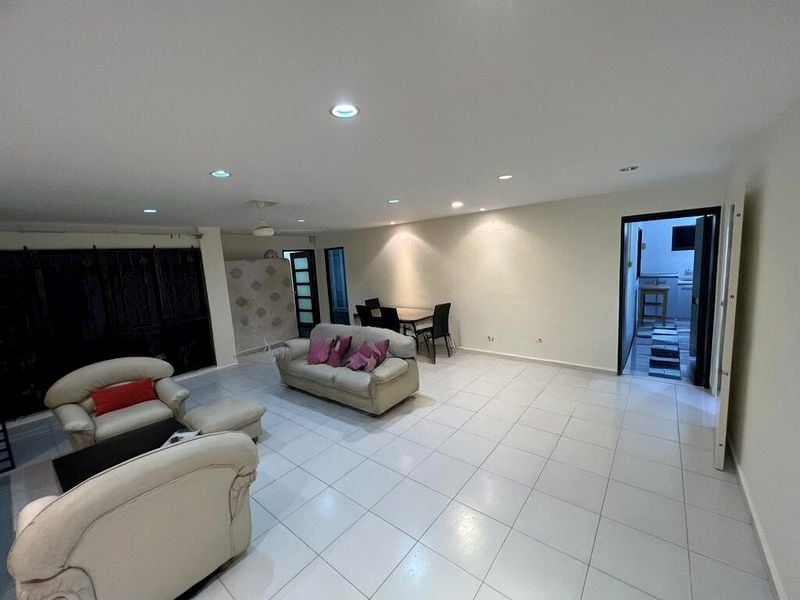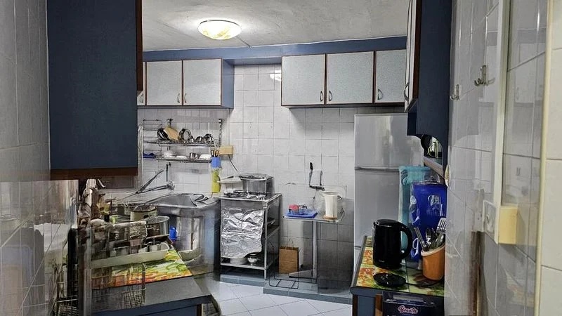 Step into this beautifully renovated 3-bedroom flat and be greeted by a bright and functional ambiance, enhanced by large windows that frame serene greenery views. The polished tile flooring and decorative ceiling medallions add a touch of elegance, while the dual-tone purple and white kitchen cabinetry creates a striking focal point that invites culinary creativity.