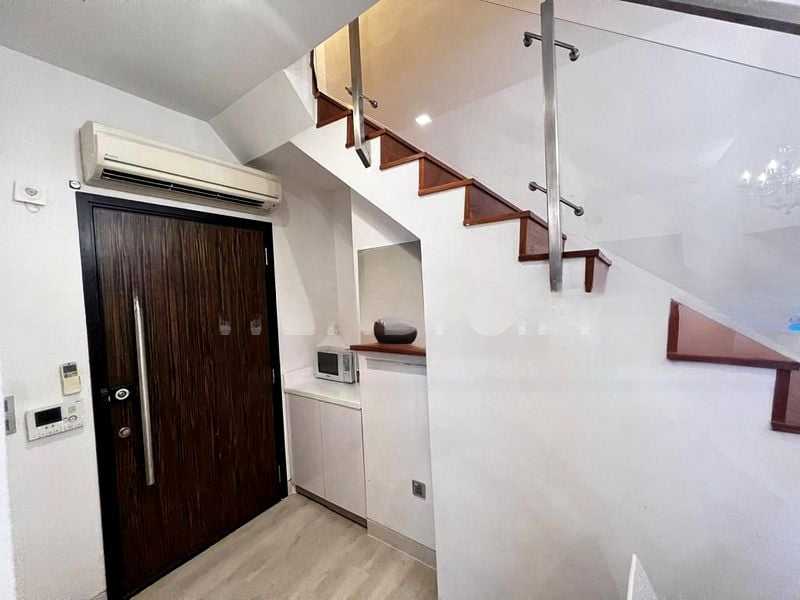 This well-maintained unit boasts an open concept layout, perfect for contemporary living. The compact kitchenette is cleverly designed with under-stair cabinets for optimal storage, while the master bedroom offers a serene retreat with a frosted glass sliding wardrobe and a cozy bay window nook. The second bedroom is equally charming, complete with a playful wall decal and sliding wardrobe.