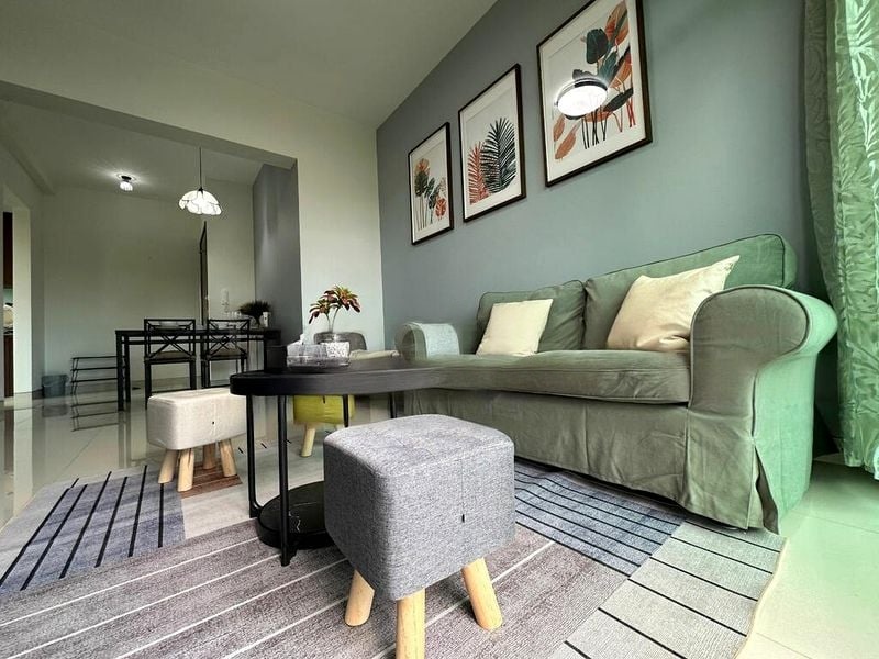Step into a sanctuary of light and tranquility at D'OASIA, where abundant natural light floods the space, enhancing the bright and airy ambiance. The stunning views of lush greenery and low-rise residential areas create a serene backdrop, complemented by tasteful finishes such as wood-look balcony decking and elegant floral pendant lights.