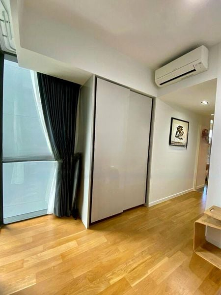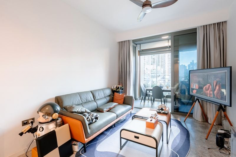 Step into a world of modern elegance as you enter this beautifully renovated unit at RIVIERE. Bathed in abundant natural light, the open-concept living area features marble flooring and a designer wavy-pattern rug that invites comfort and style. Floor-to-ceiling sliding glass doors lead to a private balcony, offering panoramic views of the city skyline and lush greenery, creating a serene escape in the heart of Singapore.
