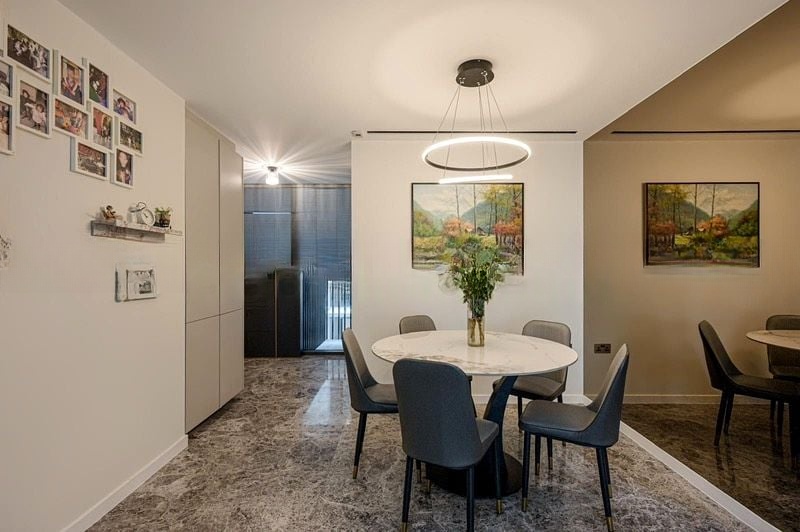 This well-maintained 2-bedroom, 2-bathroom unit boasts standout features including a sleek kitchen with dark stone countertops and integrated appliances, a marble-top dining table perfect for entertaining, and a cozy living room adorned with a grey leather sofa and vibrant accents. The thoughtful layout maximizes space and functionality, making it ideal for modern living.
