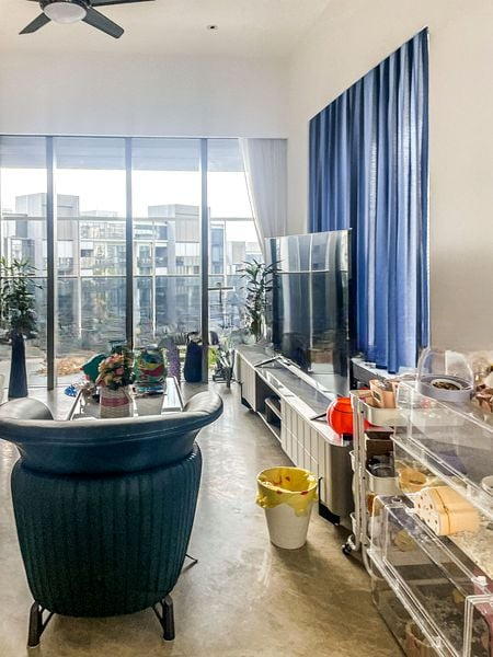 Step into a realm of modern luxury where abundant natural light dances across the marble flooring, accentuating the designer finishes throughout. The double-volume ceiling and floor-to-ceiling windows create an airy ambiance, offering breathtaking views of the city skyline that invite you to unwind in style.