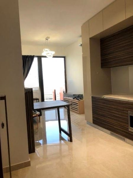 This thoughtfully renovated unit features a compact kitchenette equipped with dark wood-grain cabinetry, an induction hob, and integrated appliances for effortless cooking. The bedroom boasts built-in sliding wardrobes and en-suite bathroom access, while the bathroom showcases a luxurious rain shower, glass enclosure, and a backlit vanity mirror, perfect for your daily routines.