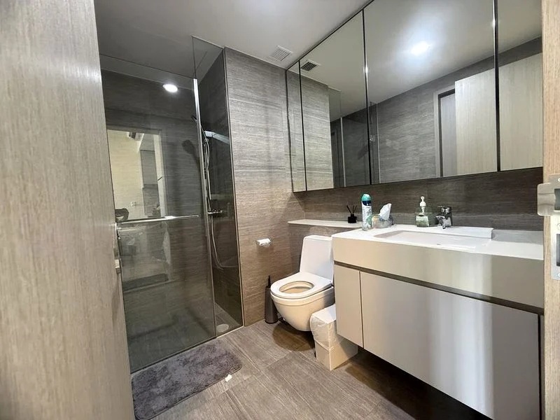 This well-maintained 1-bedroom unit boasts a spacious living room with a plush blue velvet sofa, perfect for unwinding after a long day. The bedroom offers a tranquil retreat with a comfortable double bed and minimalist decor, while the modern bathroom is designed for convenience. Residents can indulge in full condo facilities, including a tennis court and playground, ensuring a vibrant lifestyle.