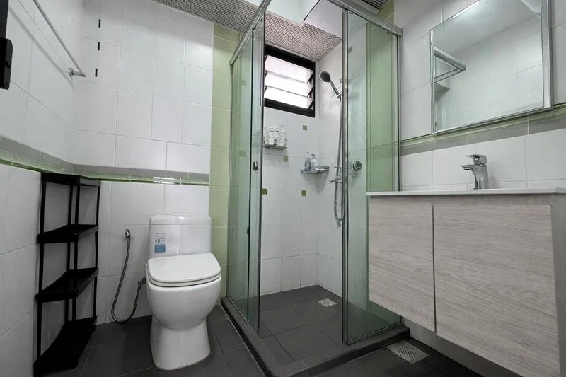 This well-maintained 3-bedroom unit features a seamless layout, with built-in floor-to-ceiling storage that maximizes space. The dining area boasts a chic wooden set illuminated by a pendant globe light, while the bathrooms showcase a modern glass shower enclosure and a sleek vessel sink atop a wooden vanity. Every corner reflects thoughtful renovation and quality finishes, ensuring a contemporary living experience.