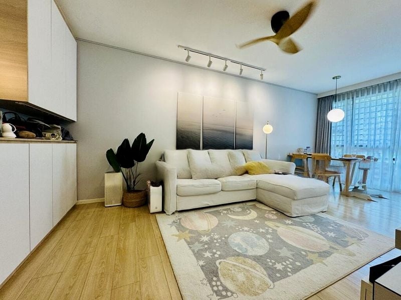Step into a bright and airy sanctuary at 57 Havelock Rd, where abundant natural light floods the open-concept living space, accentuated by modern track lighting and large windows draped with sheer curtains. The inviting ambiance is complemented by a stylish L-shaped sofa and a space-themed area rug, creating a perfect setting for relaxation and entertaining.
