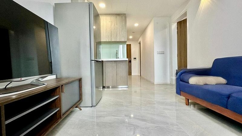 The well-designed layout features two spacious bedrooms, including a master suite with wood-look flooring and a large window that brings in more light. The kitchen is a chef's dream, equipped with an L-shaped layout, built-in oven, induction hob, and stainless steel refrigerator. The bathrooms boast contemporary vanities and glass shower enclosures, ensuring a luxurious experience.