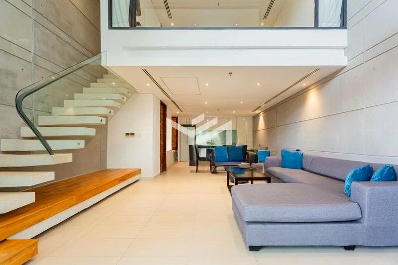 Step into a world of modern elegance as you enter this beautifully designed maisonette at The Balmoral. The abundant natural light floods the open-concept living area, accentuating the double-volume high ceilings and the striking concrete-look feature wall. The floating staircase with glass balustrade adds a touch of sophistication, while floor-to-ceiling windows frame picturesque views of lush greenery and neighboring buildings, creating a serene ambiance.