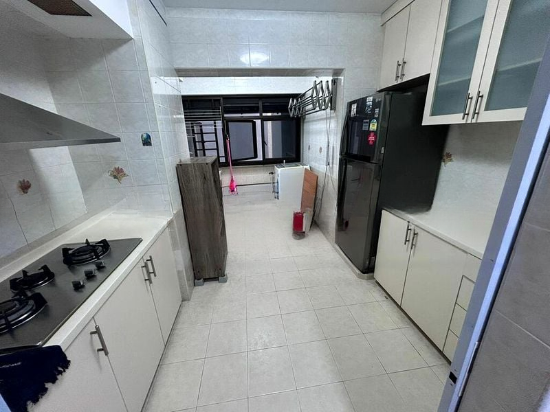 This well-maintained unit features three spacious bedrooms, each equipped with air conditioning and large windows that invite the outdoors in. The kitchen boasts modern amenities, including a gas hob and integrated shelving, while the bathroom is stylishly fitted with a vanity unit and wall-mounted bidet spray. Enjoy the comfort of dual ceiling fans in the living area, enhancing the overall cozy feel of this home.