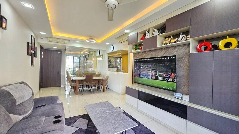 Step into a beautifully renovated oasis at Signature at Yishun, where abundant natural light floods the open-plan living area, highlighting polished tile flooring and custom carpentry that exudes modern elegance. The cozy ambiance is enhanced by cove lighting and a stunning mirror feature wall in the dining area, creating a warm and inviting space perfect for relaxation or entertaining.