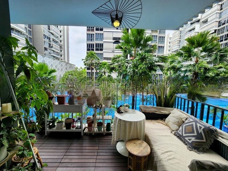 This well-maintained unit boasts three spacious bedrooms, including a master suite with a luxurious TV feature wall and large windows draped in sheer curtains, offering serene views of the surrounding greenery. The galley kitchen features minimalist white cabinetry and integrated appliances, while the balcony, complete with invisible grilles and wood-look flooring, provides a stylish outdoor retreat.