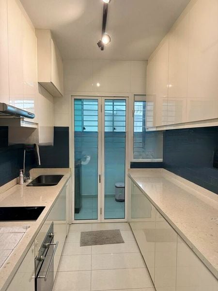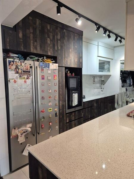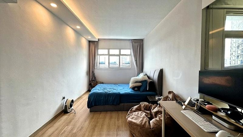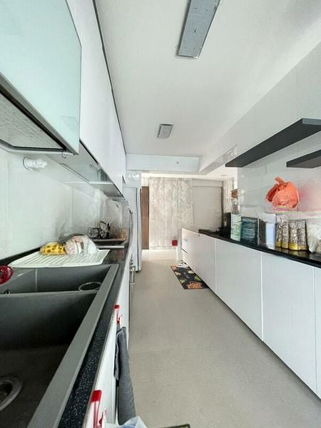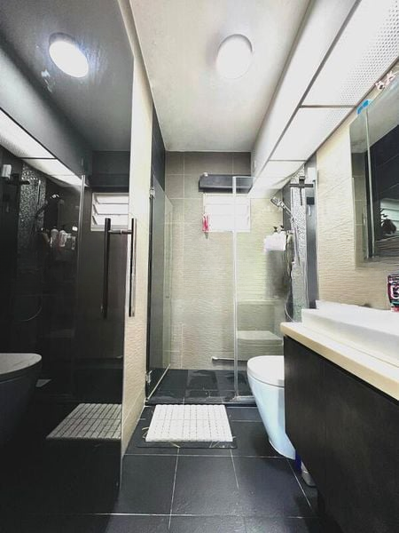 This well-maintained HDB unit features three spacious bedrooms, including a master suite with recessed cove lighting and an integrated study area. The galley kitchen boasts dual-tone cabinetry and white countertops, perfect for culinary enthusiasts. The luxurious bathroom showcases a vessel sink and a black-framed glass shower enclosure, while the built-in study desk in the dedicated study area offers a perfect work-from-home solution.
