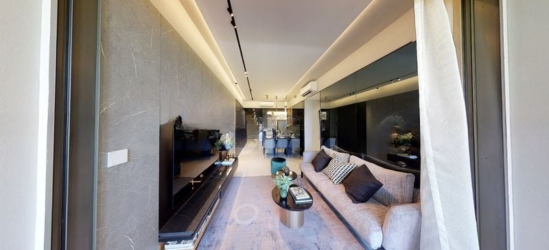Step into this beautifully renovated 2-bedroom unit at MIDWOOD, where abundant natural light floods the open-concept living space. The modern minimalist design is accentuated by polished floor tiles and large glass sliding doors that seamlessly connect to a balcony, offering tranquil views of lush greenery and urban landscapes.